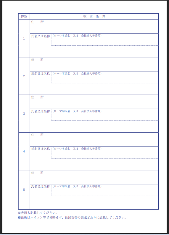 • 例えば「東京都大手町1丁目1番1号 田中一郎」について調べてほしい場合は、「件数1」の「住所」に東京都大手町1丁目1番1号、「氏名又は名称」に田中一郎と書きます。