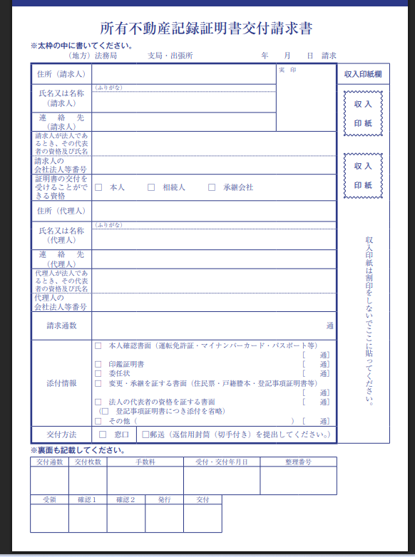 「所有不動産記録証明書交付請求書」の記入欄は、表面と裏面があります。
